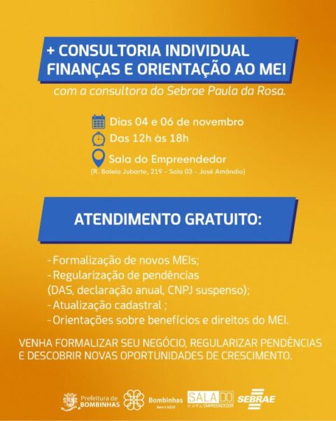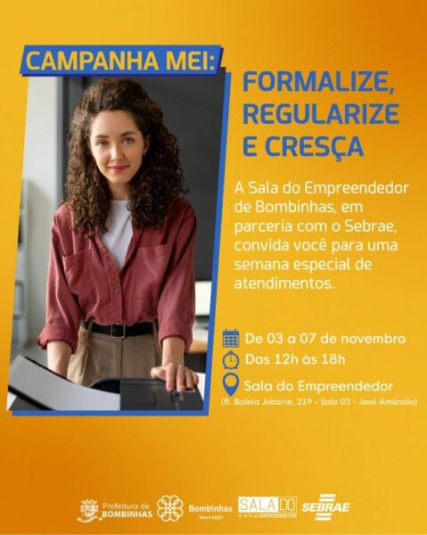 De 03 a 07 de novembro, a Sala do Empreendedor de Bombinhas, em parceria com o Sebrae/SC, realiza a campanha “MEI — Formalize, Regularize e Cresça”, uma semana especial de atendimentos e consultorias individuais voltada a microempreendedores individuais e pessoas interessadas em abrir o próprio negócio.