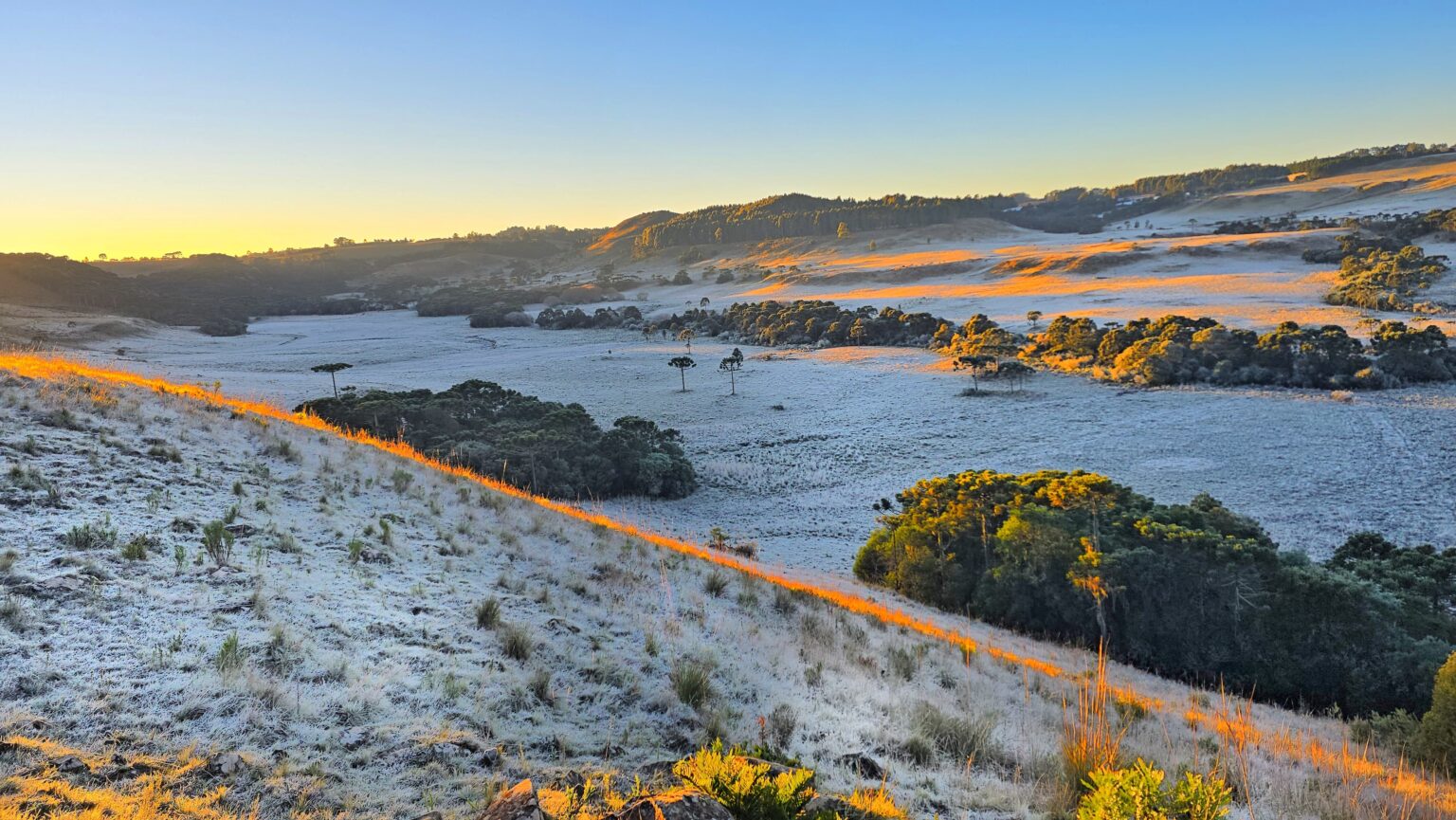 A marca negativa foi inicialmente de -6,3°C, mas caiu ainda mais por volta das 8h da manhã, quando a mínima atingiu os -6,5°C, consolidando a cidade da Serra catarinense como o epicentro do frio intenso no estado. Além de São Joaquim, Bom Jardim da Serra e Urupema também enfrentaram temperaturas negativas, com registros de -5,1°C e -5,7°C.