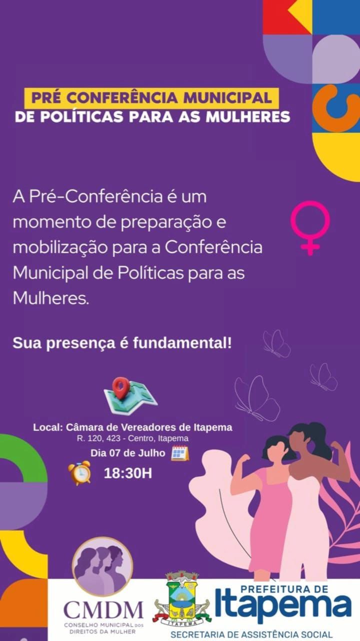 A Prefeitura de Itapema, por meio da Secretaria de Assistência Social e do Conselho Municipal dos Direitos da Mulher (CMDM), realiza nesta segunda-feira (07) a Pré-Conferência Municipal de Políticas para as Mulheres. O encontro tem como objetivo mobilizar e preparar a sociedade para a futura Conferência Municipal, promovendo o debate e a construção coletiva de propostas voltadas aos direitos e à qualidade de vida das mulheres.
