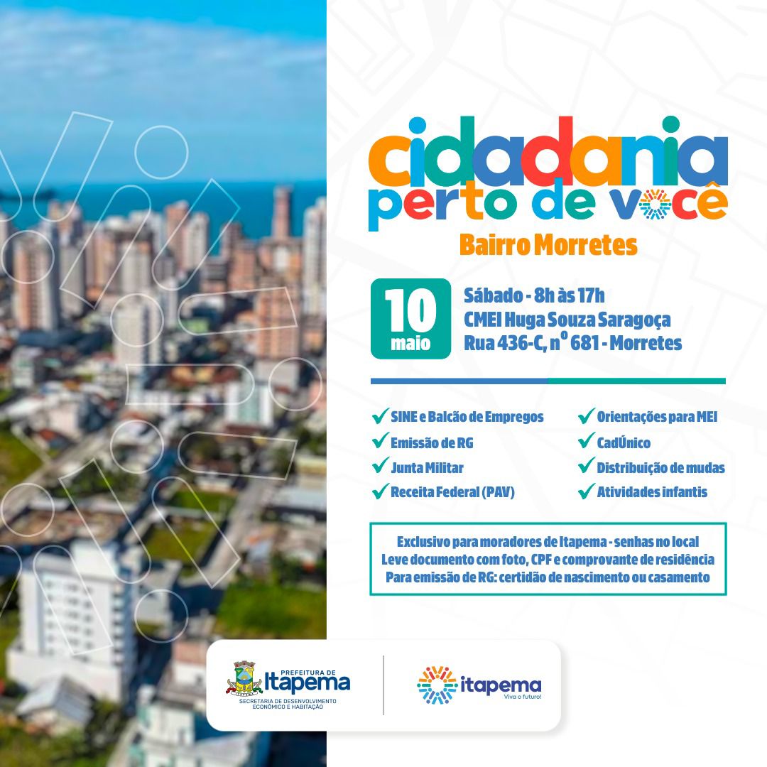 A Secretaria de Desenvolvimento Econômico e Habitação inicia neste sábado (10/05) o programa Cidadania Perto de Você, uma iniciativa inédita que tem como objetivo aproximar os serviços de cidadania da população nos bairros de Itapema. A primeira edição acontece no CMEI Huga Souza Saragoça, localizado na Rua 436C, nº 681, no bairro Morretes. O atendimento será das 8h às 17h, com distribuição de senhas.