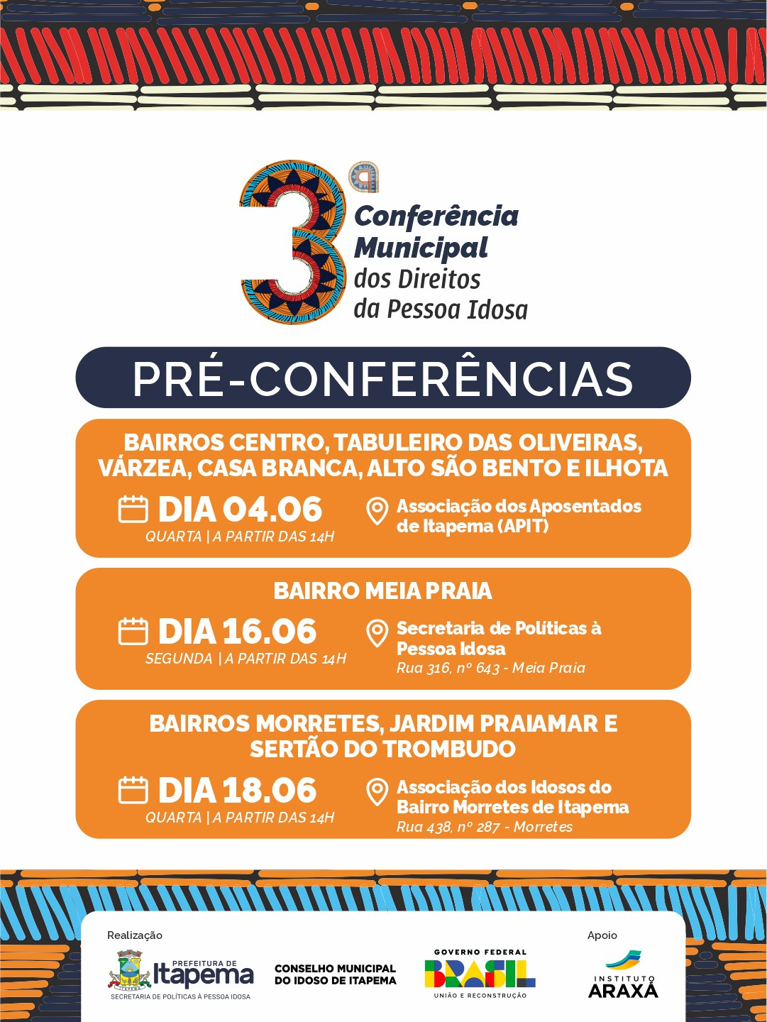 A Secretaria de Políticas à Pessoa Idosa de Itapema realiza mais uma pré-conferência municipal na próxima segunda-feira (16/06). O encontro será destinado aos moradores da Região Meia Praia e acontece na sede da secretaria (Rua 316, nº 643, no Bairro Meia Praia), a partir das 14h.