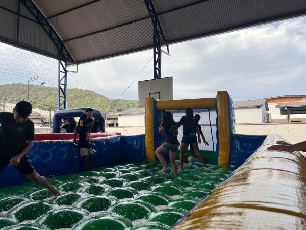 A Escola Cívico-Militar Maria Linhares de Souza viveu um dia de alegria e integração nesta quarta-feira (08), durante a programação da Semana da Criança. O pátio da unidade foi transformado em um grande espaço de recreação, com brinquedos infláveis, escorregadores aquáticos e jogos de mesa, proporcionando momentos de diversão e convivência entre os estudantes.