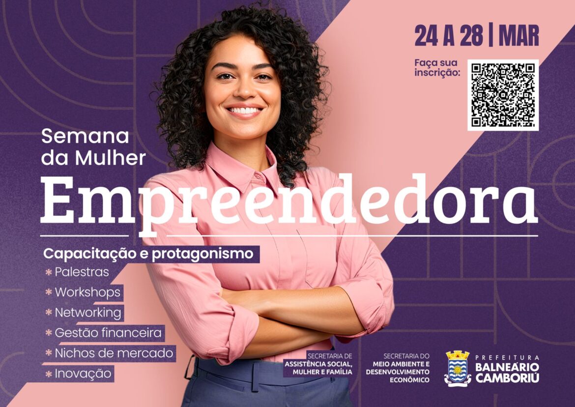 Na próxima semana, a Prefeitura de Balneário Camboriú promove um evento destinado a empreendedoras ou interessadas em empreender. É a Semana da Mulher Empreendedora, que começa segunda (24) e vai até sexta-feira (28), sempre de manhã (confira a programação abaixo). Inicialmente previsto para ocorrer na Casa dos Conselhos, o evento foi transferido para o Centro de Treinamento Comunitário (CTC), um local mais amplo, e ganhou mais um dia para possibilitar maior participação do público feminino.