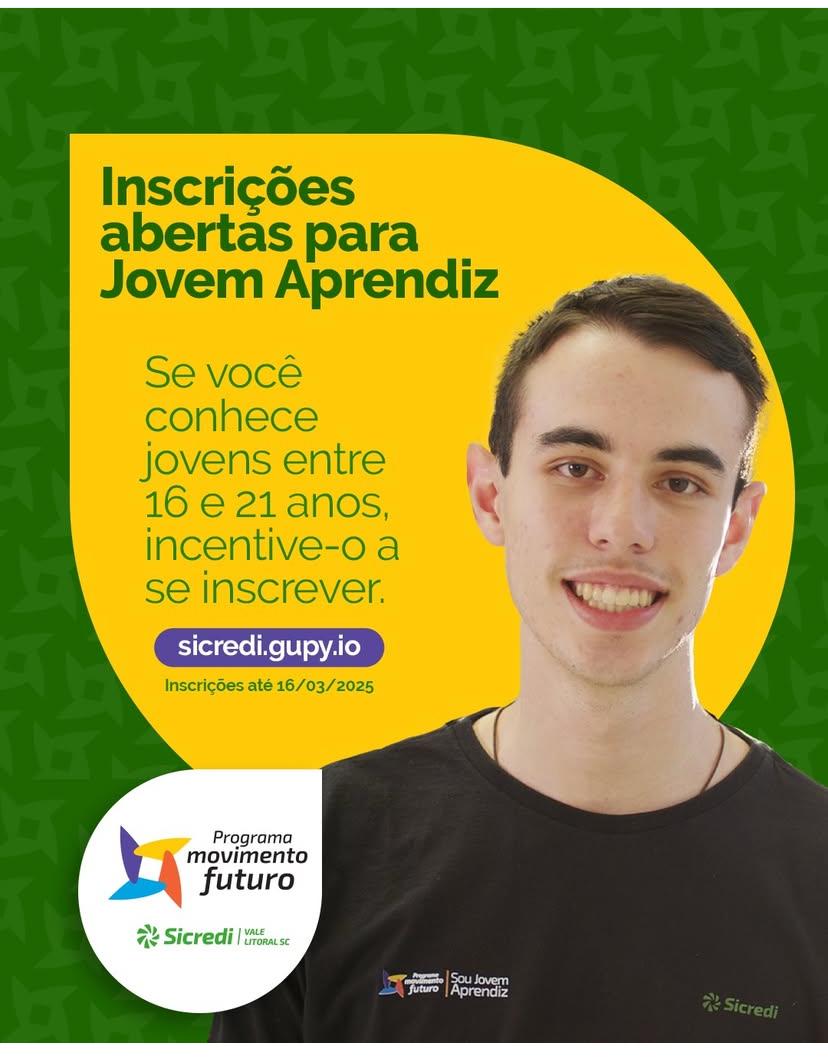 A Sicredi Vale Litoral SC está com inscrições abertas para o programa Movimento Futuro, voltado para jovens entre 16 e 21 anos que desejam desenvolver suas habilidades profissionais e ter uma experiência no mercado de trabalho. Ao todo, estão disponíveis 120 vagas para um curso de aprendizagem focado em jovens aprendizes. Os interessados podem se inscrever até o dia 16 de março pelo site: sicredi.gupy.io. Após a realização do curso, a Cooperativa estima que em torno de 30 jovens aprendizes sejam contratados para a Sede Regional e agências da região.