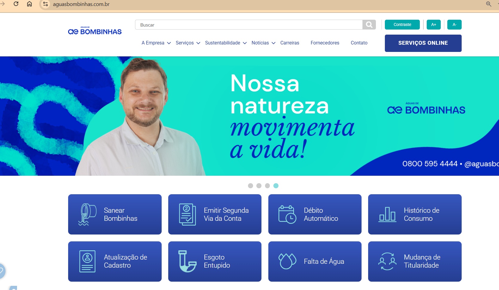 O site da Águas de Bombinhas é uma ferramenta importante de comunicação e busca de informações sobre os serviços da concessionária. A página na internet traz links para diferentes serviços. Nele, é possível emitir segunda via da fatura de água, programar o pagamento via débito automático, ver o histórico de consumo do imóvel e atualizar o cadastro junto à concessionária.