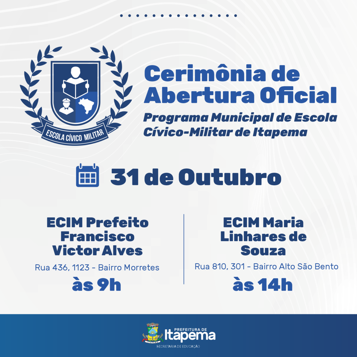 Na próxima quinta-feira (31/10) a Prefeitura de Itapema, por meio da Secretaria de Educação, vai realizar a abertura oficial do Programa Municipal de Escola Cívico-Militar do Município de Itapema. A solenidade acontecerá na ECIM Prefeito Francisco Victor Alves (Rua 436, 1123 – Bairro Morretes), às 9h e na ECIM Maria Linhares de Souza (Rua 810, 301 – Alto São Bento), às 14h.