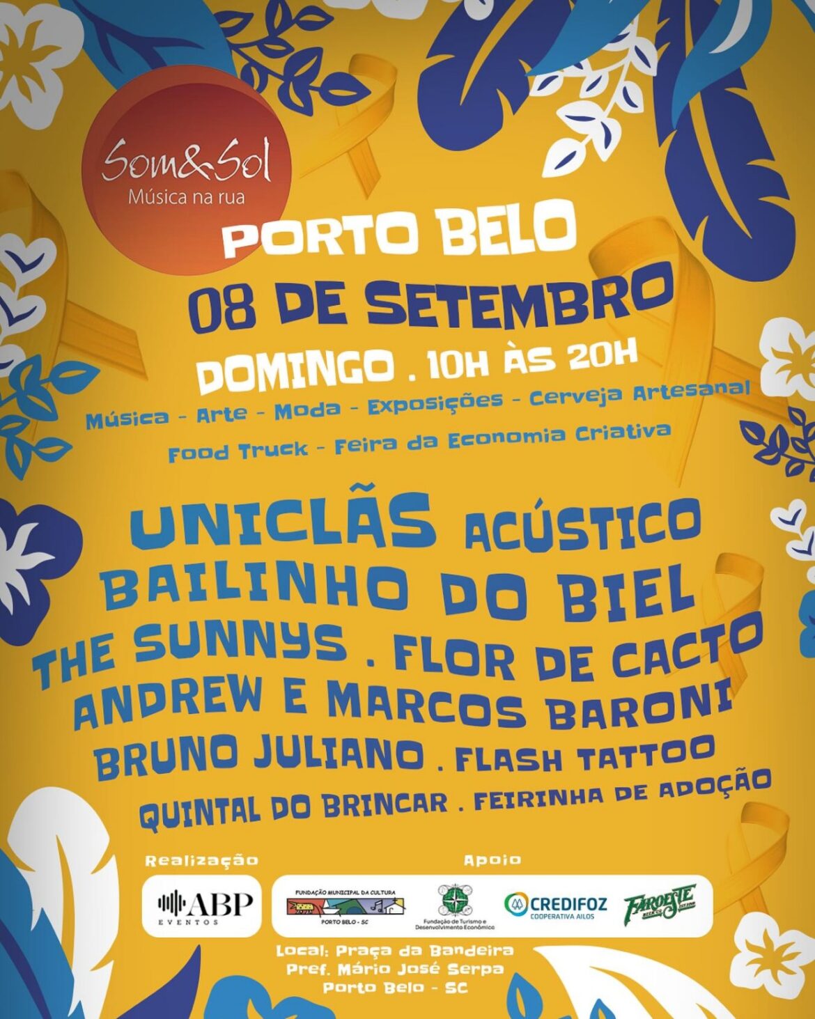 O Som&Sol – Música na Rua é realizado pela ABP Eventos com apoio da Prefeitura de Porto Belo, através da Fundação Municipal de Cultura e da Fundação Municipal de Turismo, Credifoz Cooperativa de Crédito e Faroeste Beer.