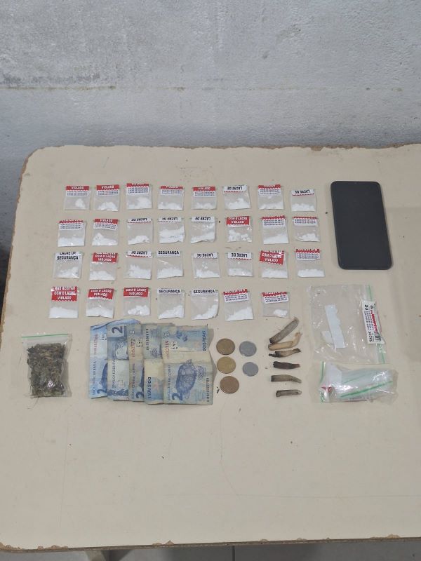 Na busca pessoal, nada de ilícito foi encontrado. No entanto, ao revistar a bolsa que o suspeito carregava, os policiais localizaram porções de cocaína já fracionadas para venda, além de uma quantia em dinheiro em espécie.