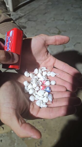 Durante a averiguação, os policiais do Tático perceberam forte odor de maconha vindo do imóvel. Ao notar a presença da guarnição, um dos suspeitos desobedeceu à ordem de abordagem e tentou fugir para o interior do terreno, dispensando porções de substância análoga à cocaína durante a tentativa de evasão. Ele foi alcançado e contido em seguida.