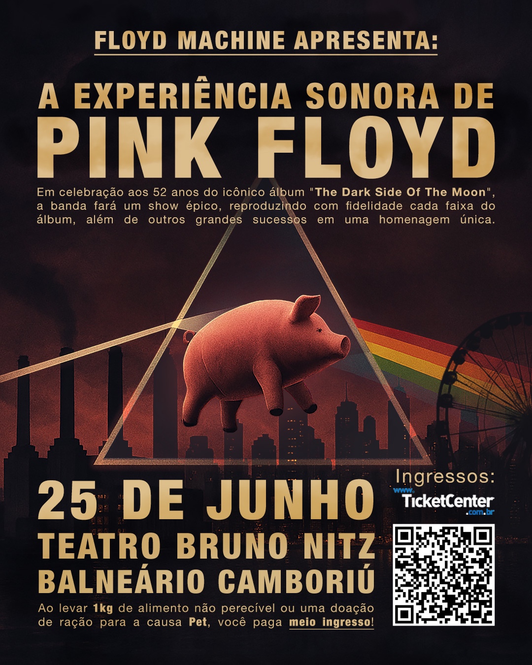 A banda Floyd Machine apresentará o espetáculo “A Experiência Sonora de Pink Floyd” no Teatro Municipal Bruno Nitz quarta-feira (25), às 20h, em uma celebração aos 52 anos do clássico álbum The Dark Side of the Moon.