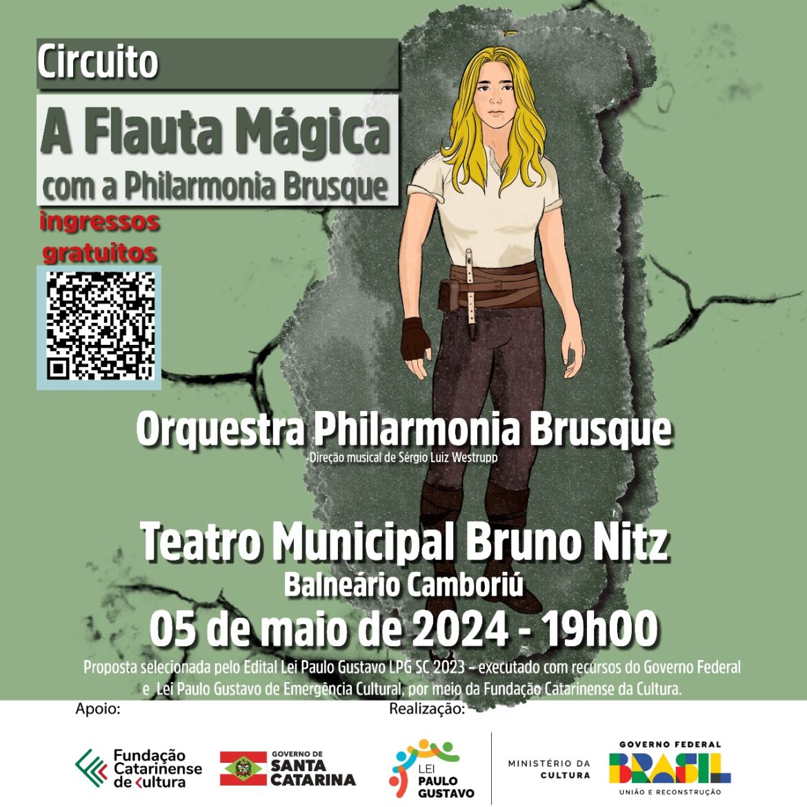 O espetáculo, que está sendo apresentado em circuito por cidades de Santa Catarina, foi selecionado pelo Edital Lei Paulo Gustavo (LPG SC 2023) e é executado com recursos do Governo Federal e Lei Paulo Gustavo de Emergência Cultural, por meio da Fundação Catarinense da Cultura.