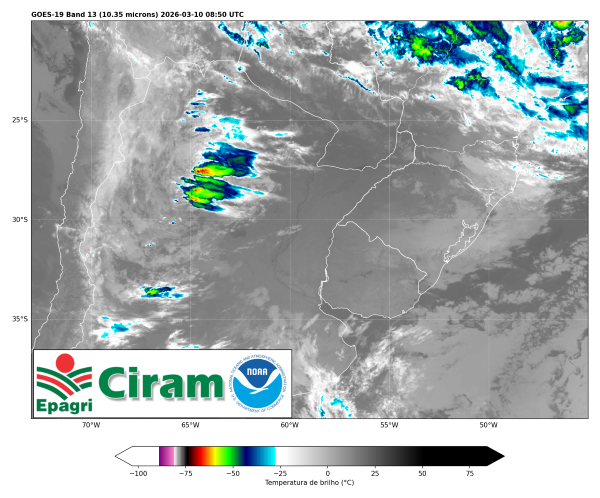 Na quinta-feira (12), o dia começa com tempo instável principalmente nas áreas próximas à divisa com o Rio Grande do Sul. Ao longo da tarde, a formação de um sistema de baixa pressão no estado vizinho intensifica as instabilidades.