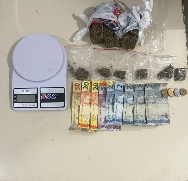 Na revista pessoal, os policiais localizaram 290 gramas de maconha, fracionadas em oito embalagens de diferentes tamanhos, além de uma balança de precisão e R$ 106,10 em dinheiro trocado, materiais comumente associados à comercialização de entorpecentes.