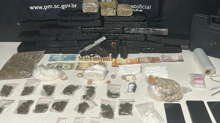 No interior do imóvel, foram encontrados 12 kg de maconha, 230 g de skank, 454 g de MD, 71 g de crack, 860 g de cocaína, R$ 1.251,00 em espécie, diversas embalagens para acondicionamento de drogas, uma pistola calibre 40, 13 munições calibre 40, um carregador de pistola 40, uma câmera de monitoramento, uma prensa hidráulica e três aparelhos celulares.