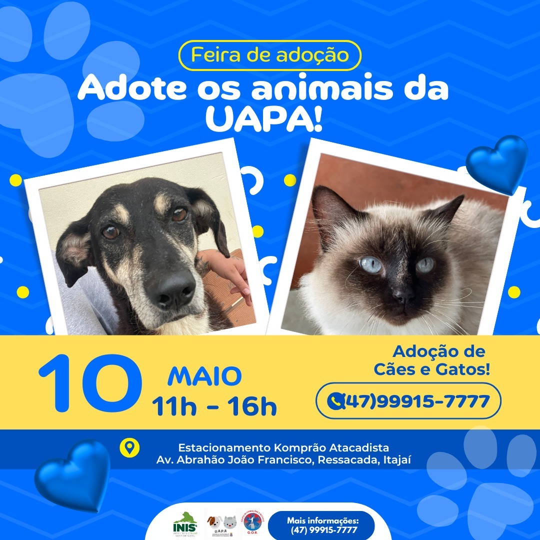 Que tal presentear sua mãe com um animalzinho da UAPA? Neste sábado (10), véspera do Dia das Mães, o Instituto Itajaí Sustentável (INIS), por meio da Unidade de Atendimento Provisório de Animais (UAPA), promove mais uma Feira de Adoção de Animais. Os animais doados já estão castrados, vacinados, vermifugados e microchipados. O evento acontecerá no estacionamento do Komprão Atacadista, das 11h às 16h.