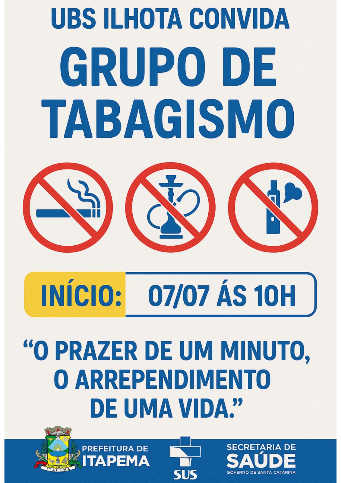 A Unidade Básica de Saúde (UBS) do bairro Ilhota, dá início a um novo Grupo de Tabagismo, voltado a pessoas que desejam parar de fumar. O primeiro encontro acontece na segunda-feira, dia 7 de julho, às 10h, com participação gratuita pelo Sistema Único de Saúde (SUS).