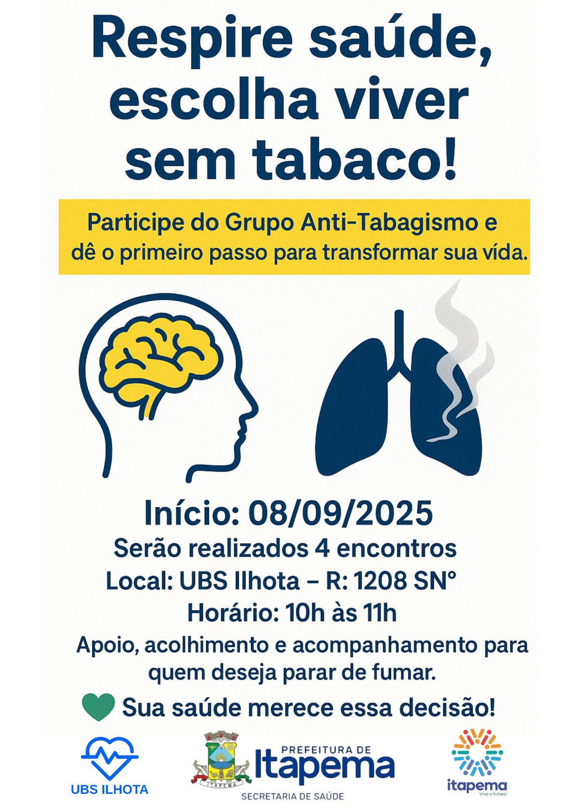 A Prefeitura de Itapema, por meio da Secretaria Municipal de Saúde, dará início ao Grupo Anti-Tabagismo no próximo dia 8 de setembro, com encontros semanais sempre às segundas-feiras, das 10h às 11h, na UBS Ilhota, localizada na Rua 1208. A iniciativa seguirá até o dia 29 e tem como foco apoiar moradores que desejam abandonar o hábito de fumar.