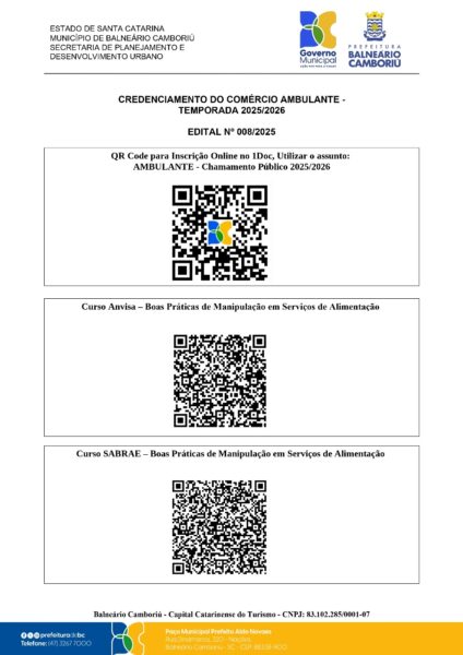 - On-line, através do sistema Protocolo 1Doc, disponível no site da prefeitura (bc.sc.gov.br), utilizando o assunto “AMBULANTE – Chamamento Público 2025/26”.