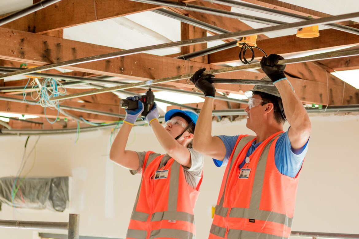 Primeiro, os voluntários que trabalham na obra, homens e mulheres, recebem treinamento para saber como usar os equipamentos de proteção individual (EPIs), como capacete, óculos de segurança e botas. Eles são orientados a nunca entrar no canteiro sem o EPI. Além disso, só pessoas treinadas podem usar ferramentas de alto risco.