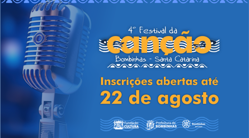 A Fundação Municipal de Cultura de Bombinhas lançou o edital para o 4º Festival da Canção, evento integrante da programação do 3º Festival do Mar, realizado entre os dias 11 a 14 de setembro. As inscrições abriram nesta segunda-feira, 21, e seguem até o dia 22 de agosto. O objetivo é promover e desenvolver a cultura, fomentar a música e incentivar novos compositores e intérpretes, elevando o intercâmbio músico-cultural regional, além de oferecer à população a oportunidade de prestigiar a arte e a cultura musical durante o Festival do Mar.