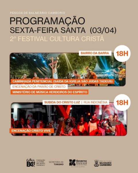 A 2ª edição do Festival de Cultura Cristã celebra a Paixão de Cristo no dia 3 de abril com duas encenações simultâneas no município. O Bairro da Barra recebe a caminhada penitencial, às 18h, com a encenação aberta ao público. Outro ponto, no Bairro das Nações, recebe a tradicional manifestação Cristo Vive, com a subida até o Complexo Cristo Luz, também às 18h, cuja encenação e visita ao complexo são gratuitas durante o evento.