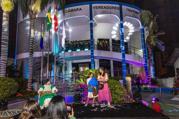 O espetáculo trouxe luz, som e a magia do Natal para a rua do Poder Legislativo, numa noite que reuniu música, teatro e cultura itapemense, aproximando servidores, vereadores e moradores em um encontro aberto ao público.